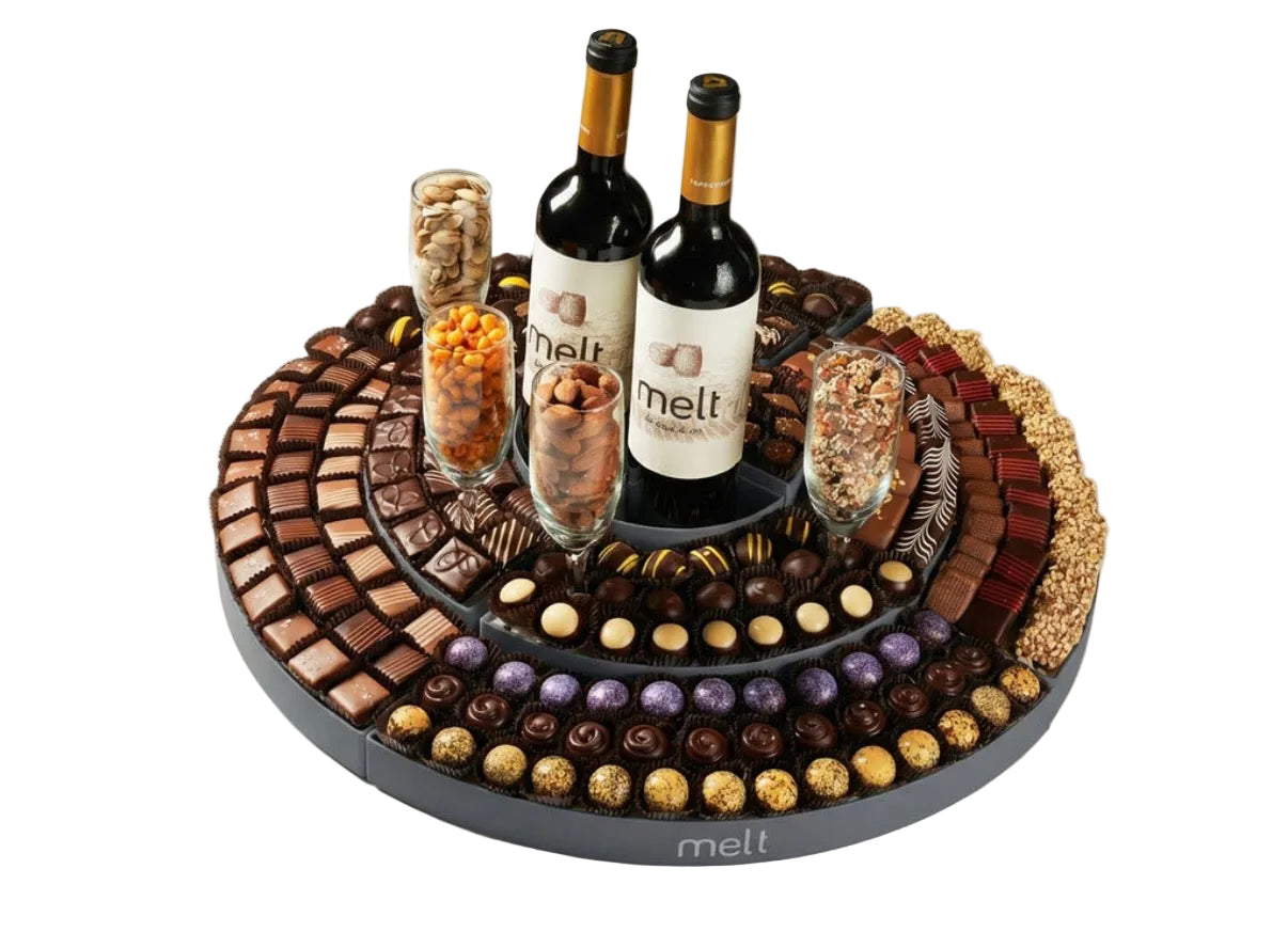 Indulge in Luxury This Purim with Meltās Ultimate Round! Make this Purim unforgettable with The Ultimate Round, a breathtaking, handcrafted chocolate arrangement designed to impress! Featuring premium chocolates, fine wine, and gourmet nuts, this stunning centerpiece is the perfect Mishloach Manot for family, friends, teachers, and colleagues.